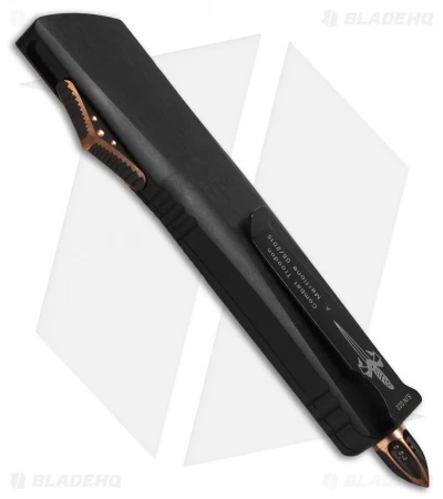This Combat Troodon from Marfione Custom Knives has a hand sculpted aluminum handle with ringed trillium copper hardware, breaker tip, and thumb slide. The double-edge blade is hand ground with a signature mirror polish and features lightning strike carbon fiber inlays. Serial number, model, date, and Marfione Dagger are found on the black coated stainless steel pocket clip. Dated 05/2015 with certificate of authenticity.