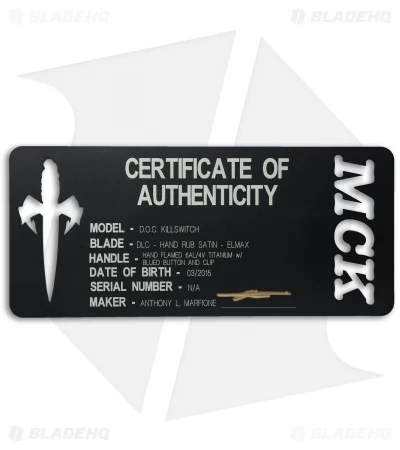 The Marfione Custom Killswitch DOC is a collaboration that harnesses the genius of Anthony Marfione and Mick Strider. This one features a hand flame colored titanium handle, backstrap, and pocket clip, marked “D.O.C. Killswitch, A. Marfione 03/2015”. The hand ground, Elmax steel blade features a DLC coating and hand rubbed satin finish. It is deployed using the ingenious “Killswitch” firing button with integrated safety. Action is smooth and strong.