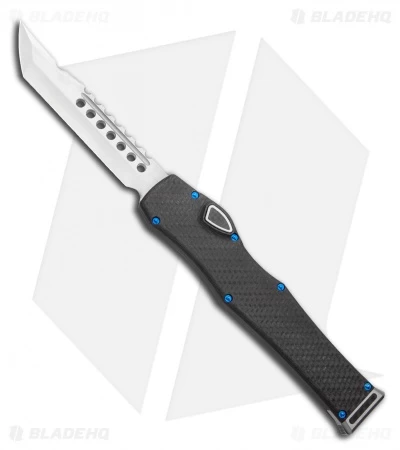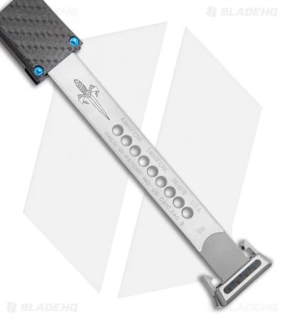 This Marfione custom Halo VI has a Hellhound Tanto blade with a mirror polished finish. Its handle is made from Mil-Spec anodized alloy and carbon fiber with blue anodized titanium hardware, and has no integrated safety on the push button. The charging handle comes marked with the Marfione Dagger and date of creation.