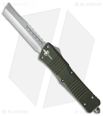 This Marfione Custom Combat Troodon automatic knife features a Hellhound Straight Razor M390 steel blade with an apocalyptic finish. It has an OD green anodized 6061-T6 aluminum handle and matching steel pocket clip and thumb slide. The model, date, and Marfione Dagger are found on the pocket clip. Dated 11/2015 with certificate of authenticity.