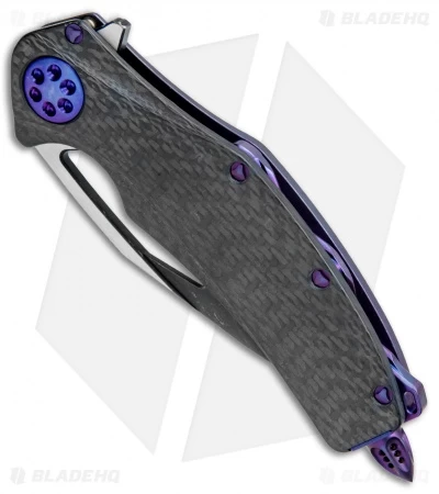 Marfione Custom Knives presents this exquisite Matrix flipper with a hand ground, M390 steel blade sporting a two-tone Dark Matter finish and a carbon fiber handle. The titanium frame lock handle is Purple Haze anodized comes outfitted with matching Purple Haze hardware. The Marfione Dagger, name, and manufacture date are marked on the pocket clip.