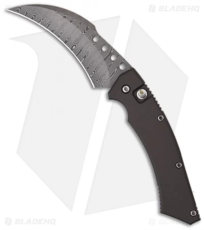 This Microtech Hawk Auto features a sterile Devin Thomas “ladder” Damascus steel blade, ground by Anthony Marfione. The black anodized aluminum handle has a satin finished tip-down carry pocket clip and hardware. Abalone push button insert.