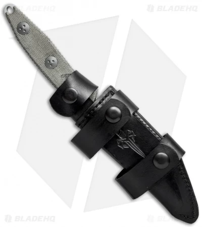 Based on the popular Microtech Socom, the Marfione Custom Socom Alpha Clip Point is a fixed blade variation of the original folder. This knife has a hand ground, stonewash finished blade with satin flats. The full-tang blade features notches around the perimeter and green canvas Micarta scales. The front side of the hollow ground blade is marked with the Marfione Dagger logo, as is the premium leather sheath from MTR Custom Leather.