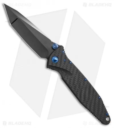 - Carbon fiber handle with blue hardware.