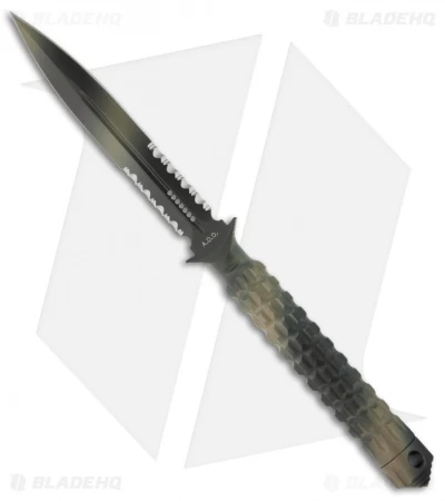 The A.D.O. (Alpha Detachment Operative) is an extraordinary fixed blade knife from Microtech. This ADO features a tan camo finished double-edge dagger blade (part serrated) and handle with a waffle-style texture. This knife follows the design of Chris Reeve fixed blades with a hollow handle, accessed by unscrewing the glass breaker tip. It is made from a solid billet of stainless steel. The A.D.O. includes a composite sheath with a spring loaded tab to secure knife and a 2″ steel clip for belt carry.