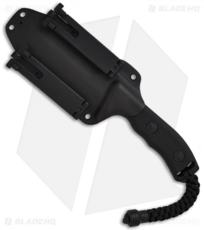 The Microtech Crosshair fixed blade knife is tried and true; this knife will hold up to the most adverse conditions. The Elmax blade is full tang, black finished and double edged. The primary blade edge is plain and the other is fully serrated. The handle has black composite scales and a braided lanyard with a stainless steel “knocker” bead. Includes a heavy duty Kydex sheath with locks.