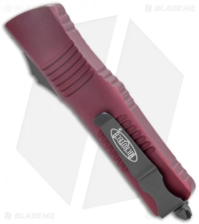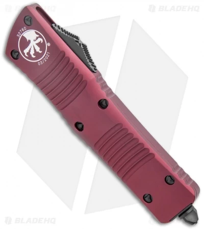 This Combat Troodon has a black finished bowie blade and a merlot red anodized aluminum handle. It comes with black finished steel glass breaker, pocket clip and hardware.