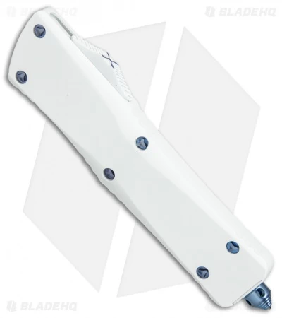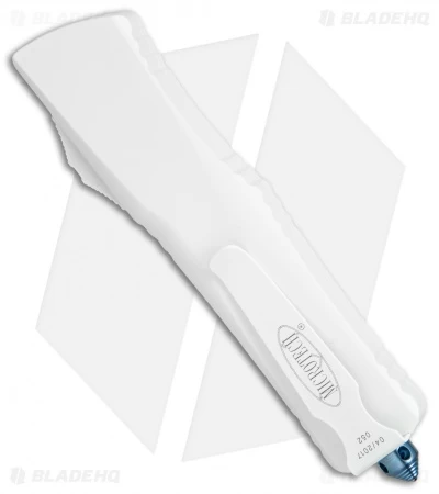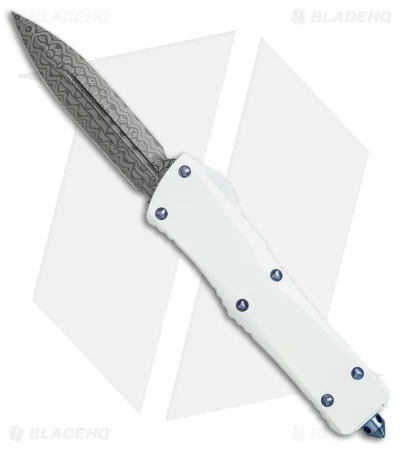 This Combat Troodon features a stunning Damascus steel double-edged dagger blade. Its aluminum handle, thumb slide, and pocket clip are white coated. The knife is accented with a blue anodized glass breaker tip and hardware.