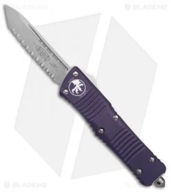 This Combat Troodon has a fully serrated, bead blast finished tanto blade and a purple anodized aluminum handle with a bead blast finished steel glass breaker, pocket clip, and hardware.