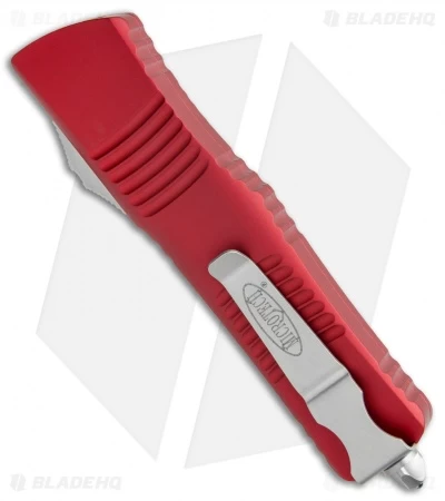 This Combat Troodon has a stonewash finished Tanto style stainless steel blade with a plain edge. The handle is red anodized aluminum with bead blast finished steel glass breaker, pocket clip and hardware.