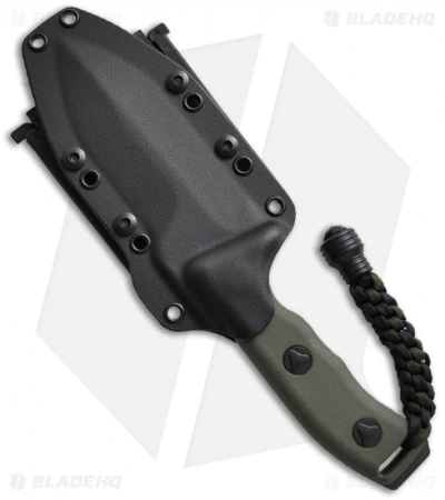 Extremely sturdy Microtech Crosshair fixed blade knife. Tried and true, this knife will hold up to some adverse conditions. The D2 tool steel blade is full tang, green finished and double edged. Both edges of the blade are plain. The handle is a green polymer with a braided lanyard and stainless steel “knocker” bead. Includes a heavy duty black Kydex sheath.