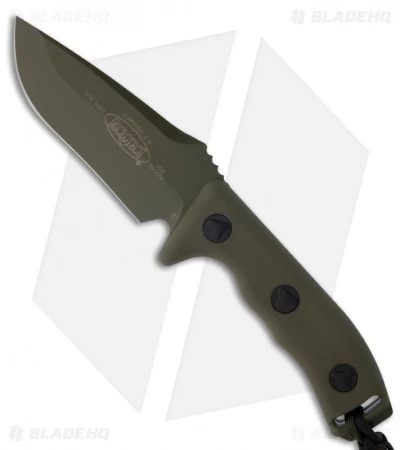 Microtech’s Currahee knife is built like a tank. It has a full-tang D2 steel drop point blade with a plain edge and tan finish. The green colored molded composite polymer handle is outfitted with a lanyard and knocker bead. Includes heavy duty sheath with MOLLE locks.