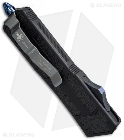 This Scarab has been given special treatment. It features a tri-tone finished Elmax steel standard blade with a double edge. The black anodized body is outfitted with blued titanium hardware, thumb slide and breaker tip. The pocket clip has the model information, including serial number, production date, and Marfione Dagger logo.