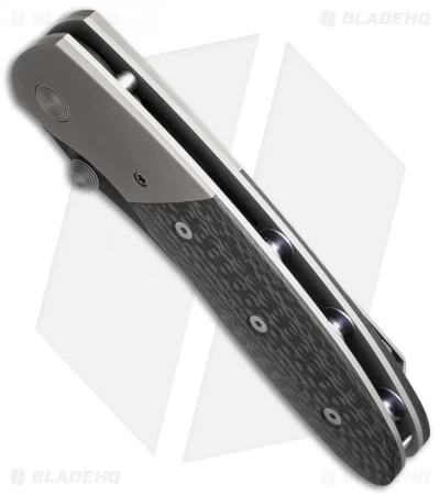 Microtech Lightfoot Compact Combat LCC M/A manual knife. This LCC features carbon fiber scales and a black coated 154-CM steel blade. Includes pocket clip and sheath with the Lightfoot logo.