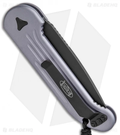 This model has a premium stainless steel blade with a black finish and a gray anodized handle with black finished hardware.