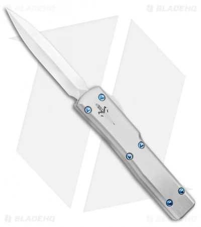 This Marfione Custom UTX-70 features a hollow ground dagger blade with a mirror edge made from CTS-204P steel. The handle is two-tone hand rubbed satin stainless steel with blue titanium hardware and the Marfione Dagger. The side is marked with the date 12/2020 and the Dagger logo.