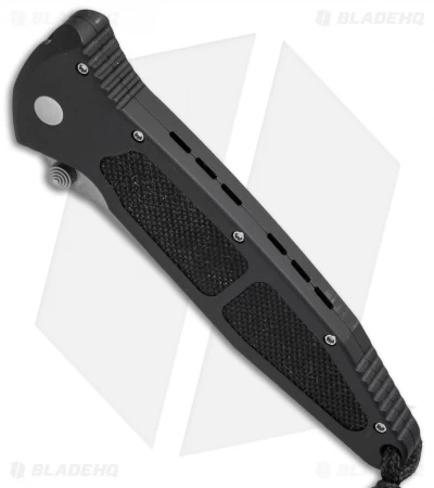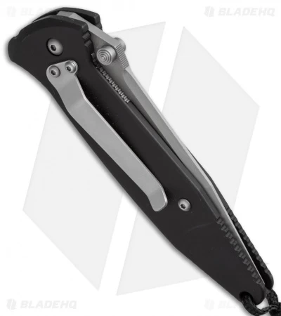 This manual folder has a black anodized aluminum handle with black grip inserts (front). The knife is equipped with a bead blast finished 154CM steel blade. The pocket clip allows for right hand, tip-down carry.
