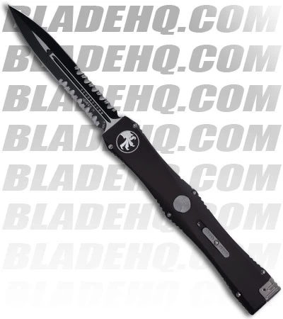This Nemesis IV knife has a black anodized aluminum handle that features a milled contoured surface. Microtech has also customized the hardware with the triangle screws and triangle “topographical” firing button. The dagger blade is black two-tone finished S35-VN steel with both edges partially serrated.