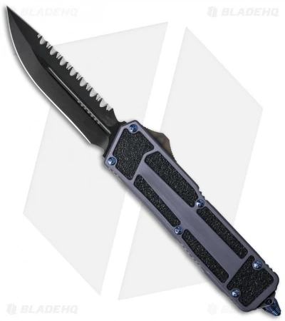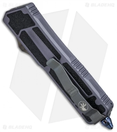 This Scarab has been given special treatment. It features a blue anodized body with bronze colored thumb slide and pocket clip along with blue hardware and breaker tip. The standard blade has a double-edge with a serrated upper edge. Model information, including serial number, production date, and Microtech Claw logo on the pocket clip.