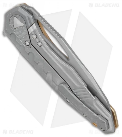 This Microtech Sigil features a brass handle with a titanium frame lock and a Damascus overtravel stop. It has a plain edged, Bohler M390 steel blade in an Apocalyptic finish.