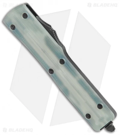 This UTX-70 features a black anodized aluminum and natural jade G-10 handle. The Drop Point blade is two tone finished with a plain edge. The pocket clip and hardware are black finished.