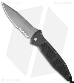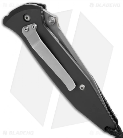 The Socom is a Microtech classic and this knife features a bead blast finished clip point blade with a partially serrated edge. Dark gray finished aluminum handle features textured grip inserts and a liner locking mechanism. The tip-down pocket clip is bead blast finished.