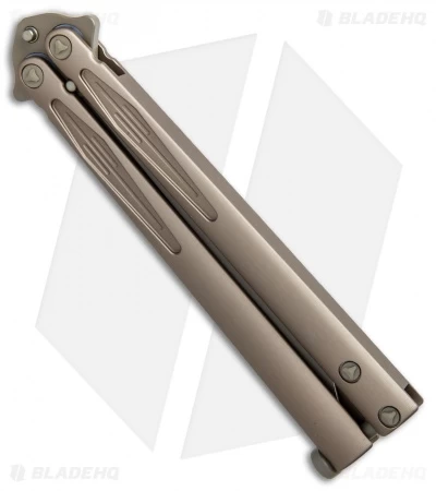 The latest generation of the Tachyon butterfly knife, the production Microtech Tachyon III, distinguishes itself from previous models with milled, single-piece channel construction handles, a spring latch, and a standard pocket clip. The blade showcases a non-sharpened swedge-ground tip and milled grooves with the Microtech logo, production date, and blade steel markings up front.