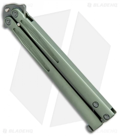 The latest generation of the Tachyon butterfly knife, the production Microtech Tachyon III, distinguishes itself from previous models with milled, single-piece channel construction handles, a spring latch, and a standard pocket clip. The blade showcases a non-sharpened swedge-ground tip and milled grooves with the Microtech logo, production date, and blade steel markings up front.