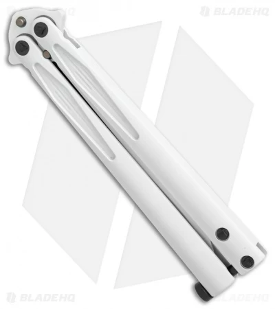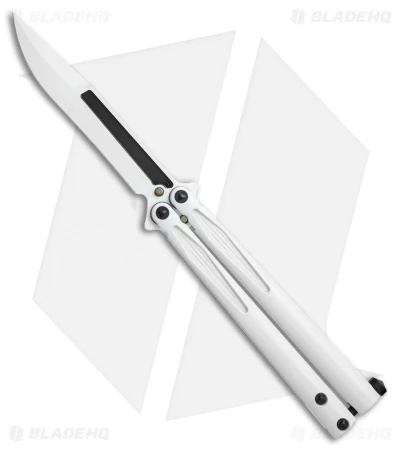 The latest generation of the Tachyon butterfly knife, the production Microtech Tachyon III, distinguishes itself from previous models with milled, single-piece channel construction handles, a spring latch, and a standard pocket clip. The blade showcases a non-sharpened swedge-ground tip and milled grooves with the Microtech logo, production date, and blade steel markings up front.
