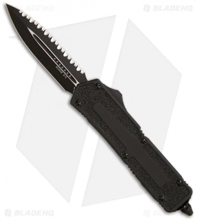 This Tactical Scarab has an S35VN stainless steel double-edged dagger blade with one plain and one fully serrated edge. Two-tone finish (black grinds and satin flats). The black anodized T6 aluminum handle has grip inserts on front and back. The hardware, pocket clip and glass breaker are black finished. Model information and Microtech/Scarab logos are on the pocket clip.