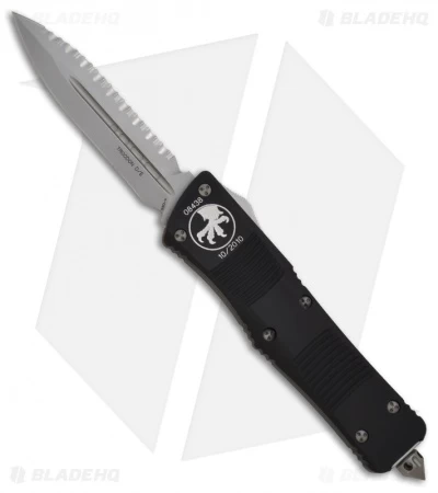 The Troodon handles are black anodized T-6 aluminum with grooves for added grip-ability. The double edged dagger blade is ELMAX steel and bead blast finished with one fully serrated edge. The knife includes a pocket clip, glass breaker & Microtech drawstring bag.