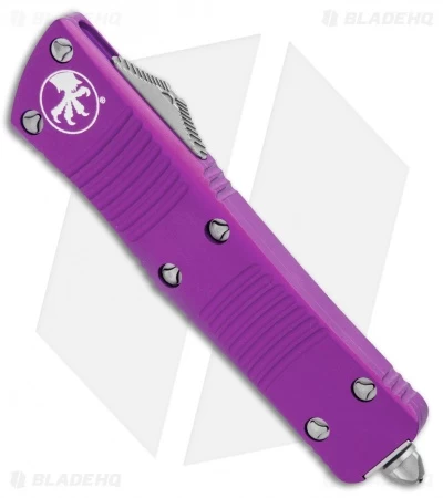 This model of the Microtech Troodon comes with a satin finished blade and a violet aluminum handle with bead blasted hardware.