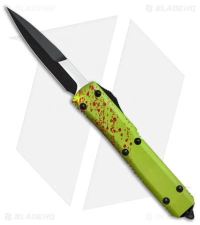 The Microtech Ultratech Zombie edition features a green handle with random blood spatter. This is a limited run. Bead blast finished bayonet, double-edged blade with a plain edge. Blood spatter pattern will vary on each knife.