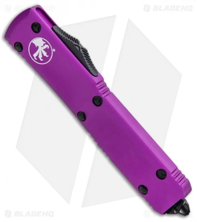 This Ultratech features a double-edged dagger blade with a black finish and a plain edge. It has a contoured, violet anodized 6061-T6 aluminum handle with a black finished pocket clip, glass breaker, and stainless steel hardware.