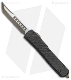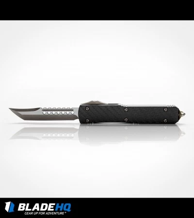 This Hellhound Ultratech from Microtech features a unique tanto blade profile and a black aluminum handle with a carbon fiber top scale. The blade is made from Elmax steel with satin flats and stonewashed grinds. Comes equipped with bronzed titanium hardware, pocket clip, thumb slide, and glass breaker.