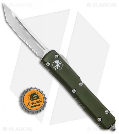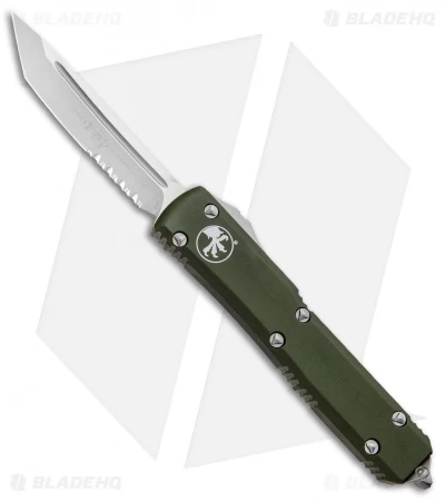 This Ultratech features a tanto blade with a satin finish and a partially serrated edge. It has a contoured, OD green anodized 6061-T6 aluminum handle with a bead blast finished pocket clip, glass breaker, and stainless steel hardware.