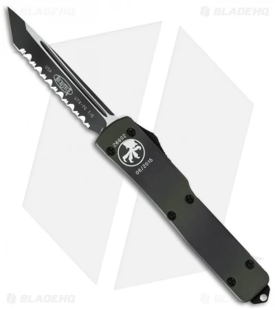 This UTX-70 has a green camo coated, fully serrated tanto blade and 6061-T6 aluminum chassis with black finished hardware and pocket clip.