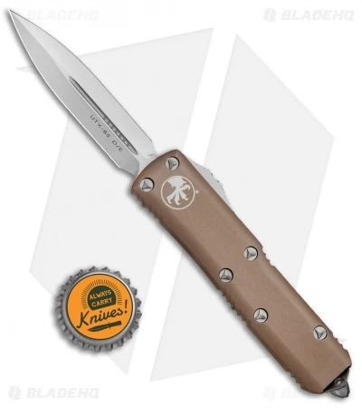 This UTX-85 model is equipped with a stonewashed, double-edged dagger blade. The 6061-T6 aluminum handle is tan anodized and outfitted with bead blast finished hardware, pocket clip, and glass breaker tip.