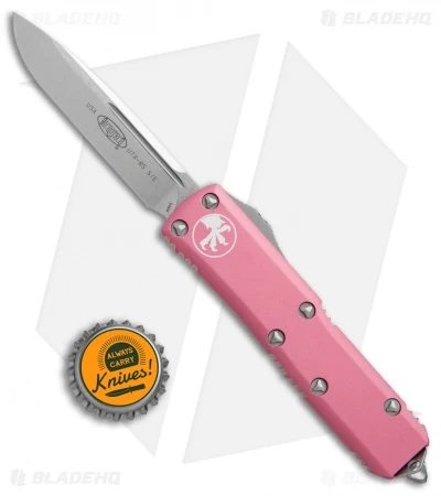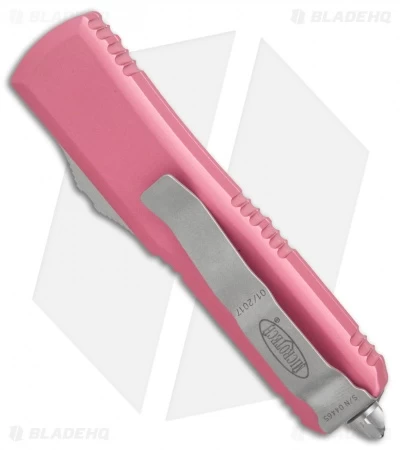 This UTX-85 has a stonewashed drop point blade made from Elmax steel. The 6061-T6 aluminum handle is pink anodized and outfitted with bead blast finished hardware, pocket clip, and glass breaker tip.