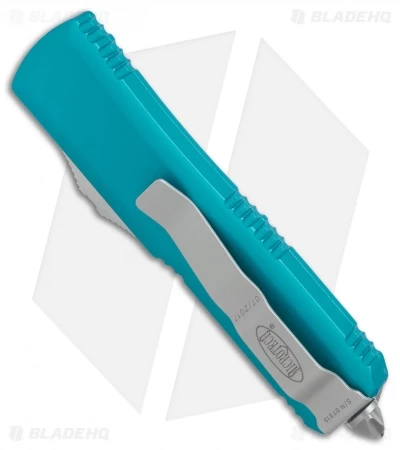 This UTX-85 model has a satin finished Bohler M390 stainless steel blade. The 6061-T6 aluminum handle is turquoise anodized and outfitted with bead blasted hardware, pocket clip, and glass breaker tip.