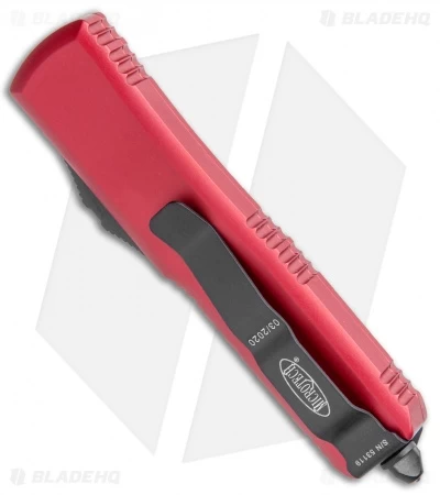 This UTX-85 model has a black finished tanto blade with a plain edge. The 6061-T6 aluminum handle is red anodized and outfitted with black hardware, pocket clip, and glass breaker tip.